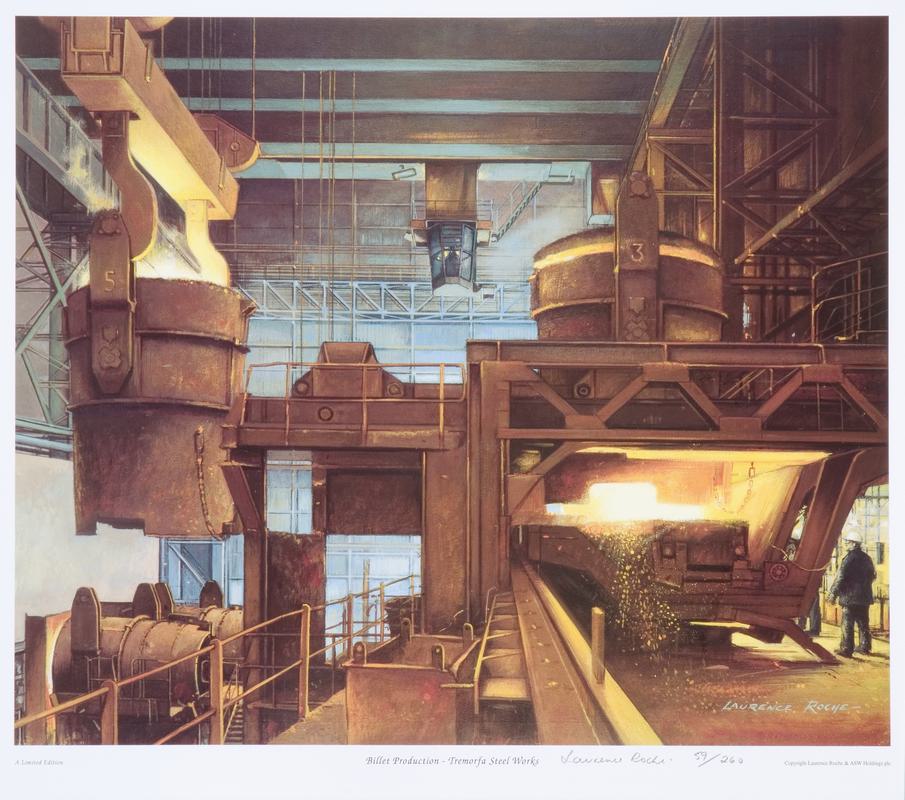Limited edition colour print (No. 211 of 260) of an original painting showing an interior view of Tremorfa steel works.