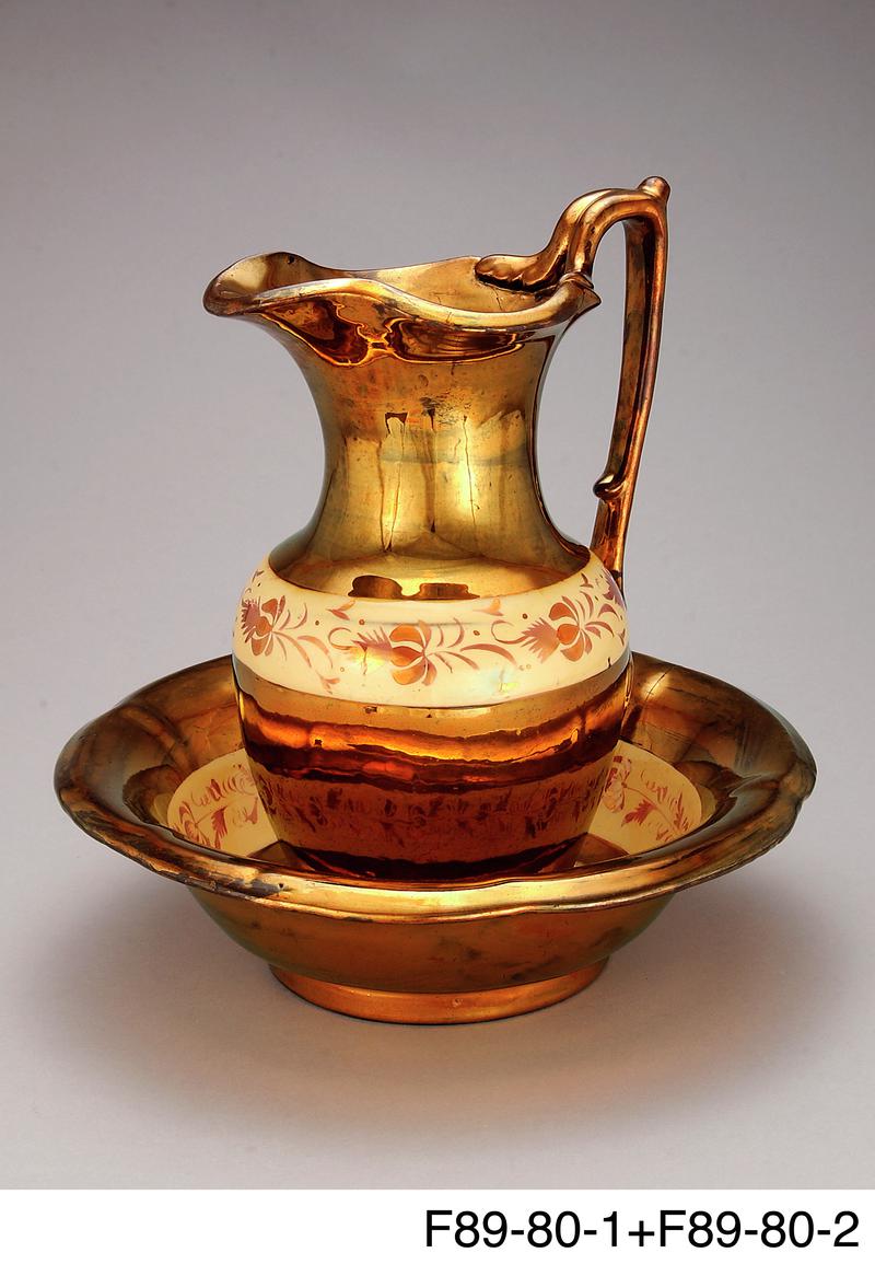 A copper lustreware bowl with a cream band running around the inside, this has been decorated with pink lustre flowers.