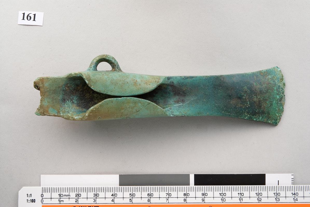 Plain socketed axe. Small fragment of a plain slender socketed axe, comprising one quarter of the mouth, the loop and part of one upper face and axe side. The external mouth shape is curved but sub-rectangular, whilst the internal mouth shape is angular and rectangular. The mouth is narrow, being approximately 25-27mm wide (external mouth at right angles to the loop), to judge by the distance from the casting seam to the mouth edge. The side of the axe appears to splay outwards with a concave curve, suggesting a slender but flared axe. A prominent casting seam extending from the mouth top and down the side indicates that this axe was not finished. The axe has a wide and straight-sided blocky collar, whose lower edge is defined by a step (i.e. onset). The loop extends from beneath this collar. The fragment shows ample evidence of breakage through bending and twisting: there is a tear on the mouth and a partial tear on the lower interior face, whilst the face section is clearly bent and twisted. The fragment has a grey-green patina.