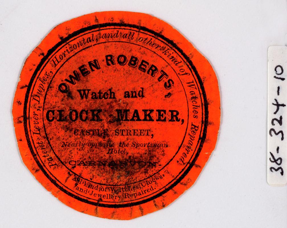 Watch case paper 'J.D. Jones, Watch & Clock Maker, Pwllheli'.