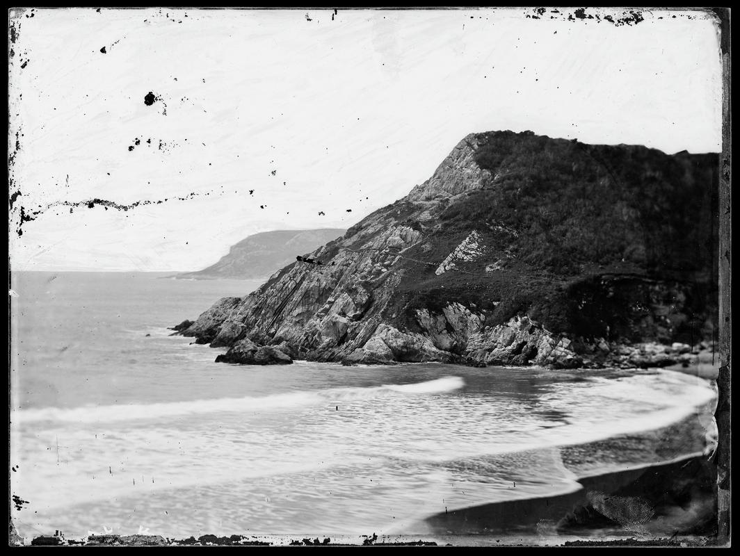 Collodion gass negative showing Thereza Llewelyn seated on the rocks with a basket. Possibly taken at Caswell.