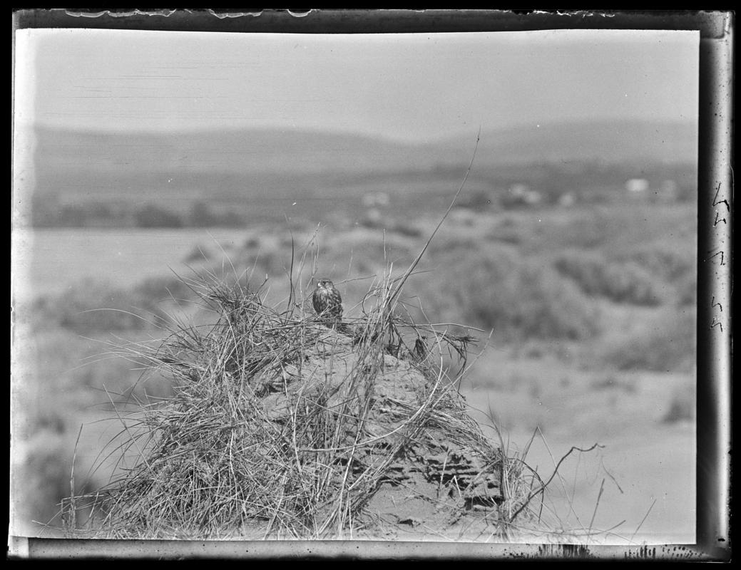 A female Merlin (Falco columbarius) sitting near Cantref Reservoir, Nant-Ddu, Cwm Taf, Merthyr Tydfil. Photographed 23 May, 1910. Exposed at f/22 (F).