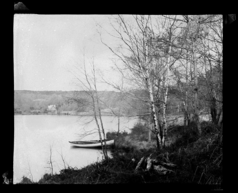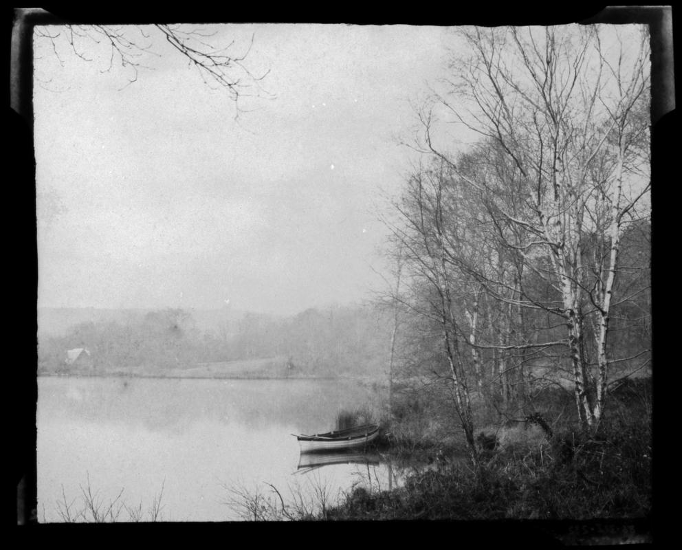 Calotype negative showing the Lower Lake at Penllergare with the boathouse in the distance. Tab at each corner