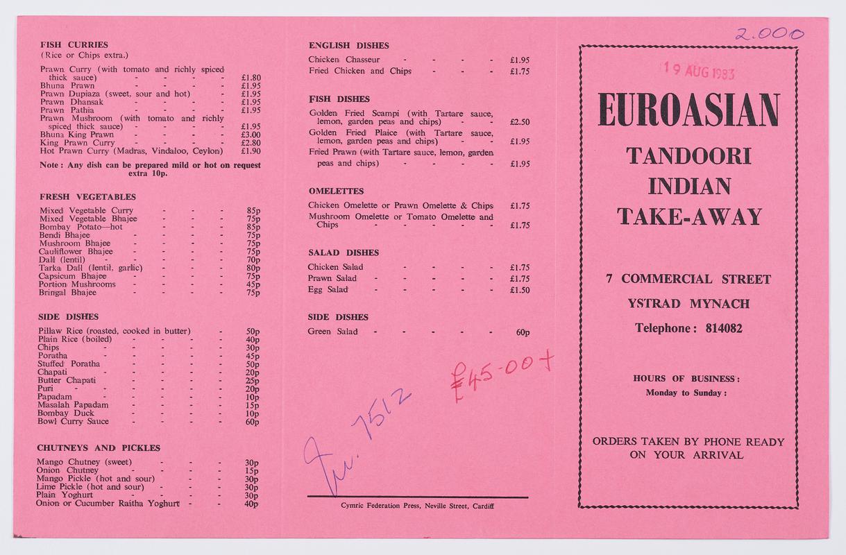 Customer bill 'Rose of India Tandoori Restaurant', Newport. Handwritten order details on the front. Stamped with date 30 July 1986.