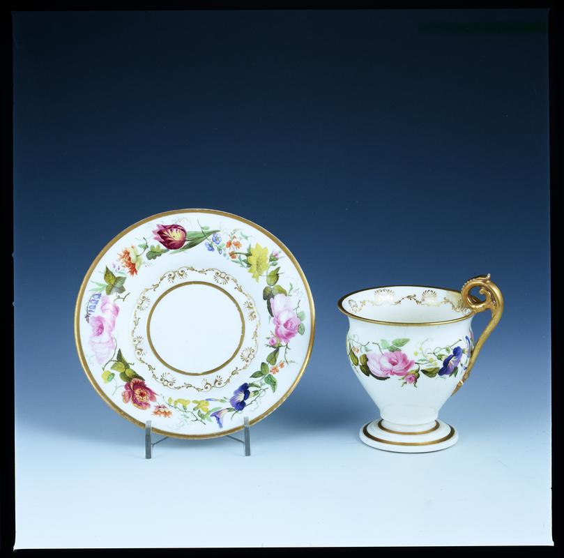 Breakfast cup and saucer, soft-paste ('duck egg') porcelain, the cup standing on a foot ring, with curved sides and slightly everted rim, loop handle with inner spur, the saucer with slightly spreading foot ring and plain curved sides; both cup and saucer enamelled with named birds, a blue hawk and chatterer on the cup, a heron on the saucer, with gilded border of continuous scrolls on the saucer.