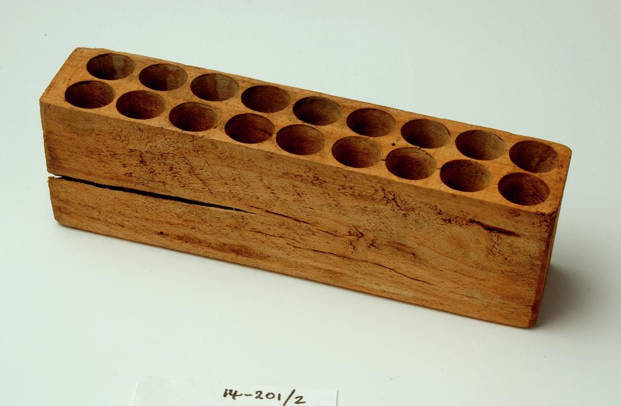 White enamelled holder, with saucer shaped base; dark blue enamelled handle and rim.