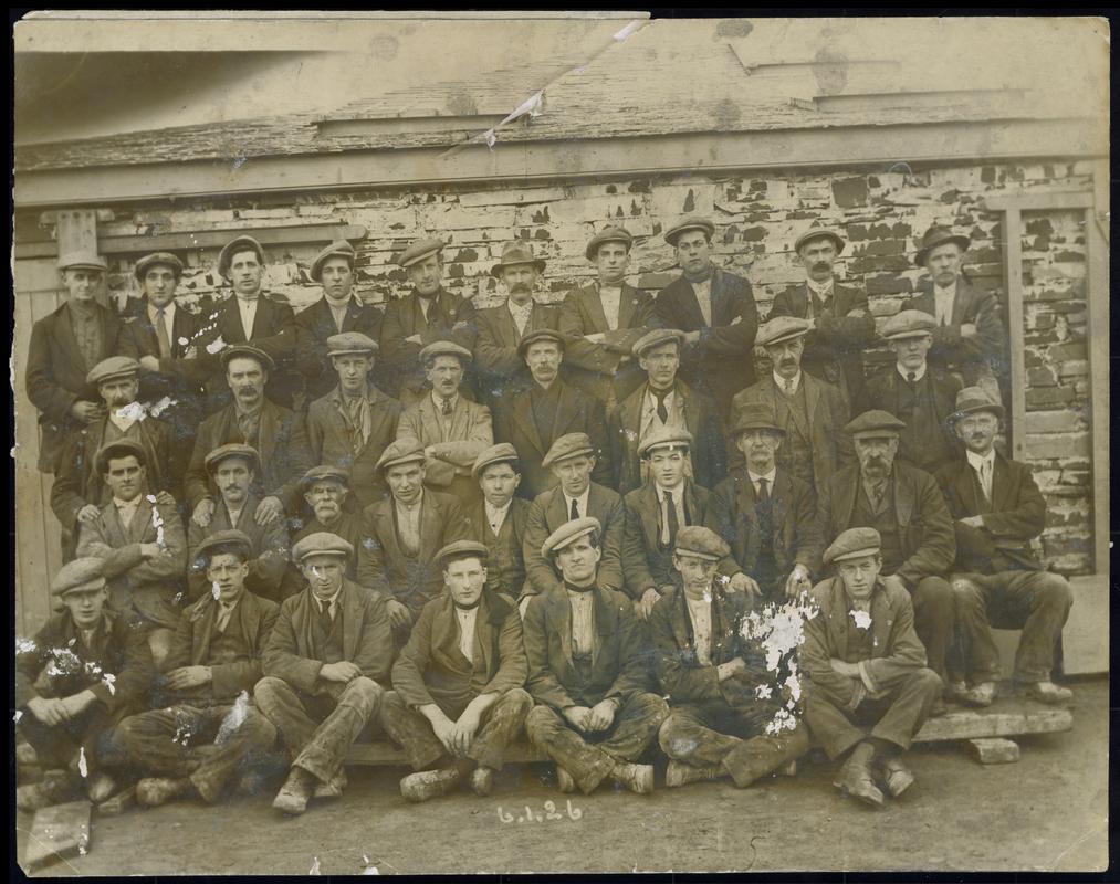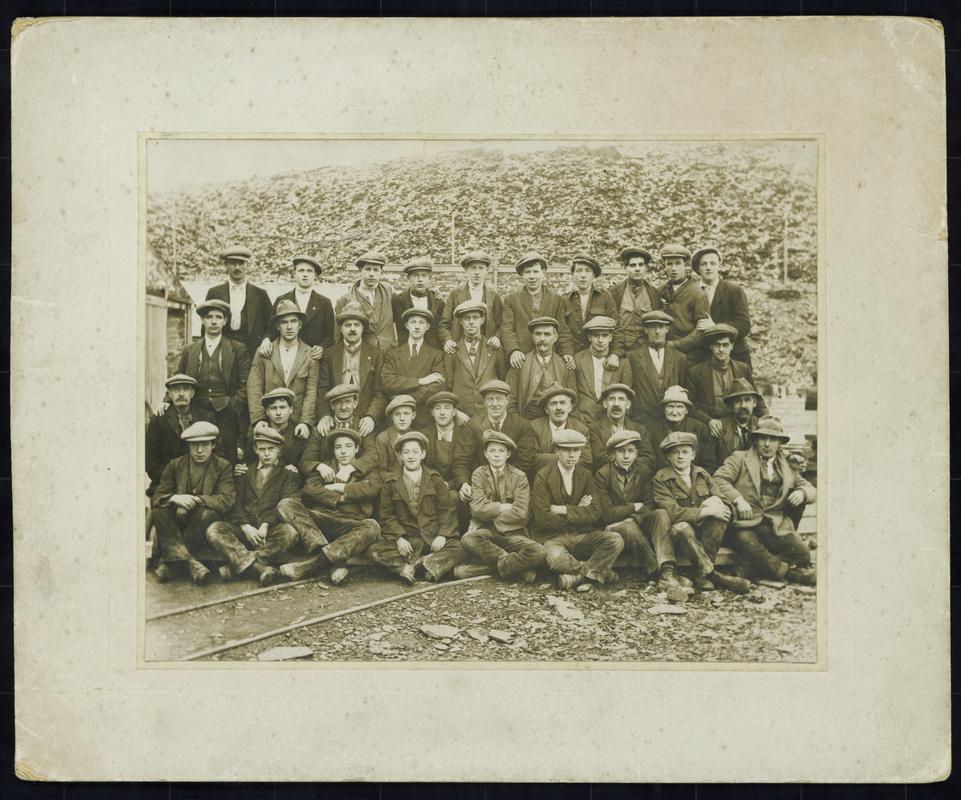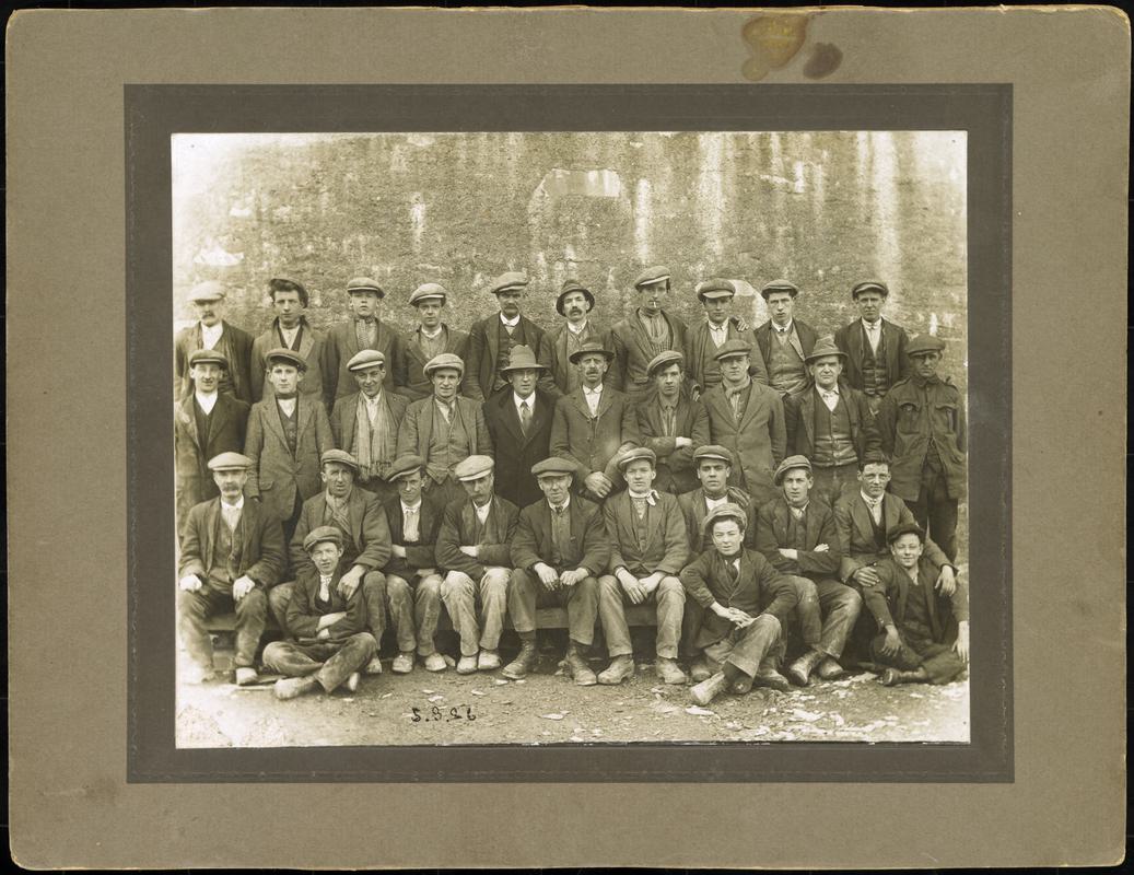 Group photograph of 24 men. Mounted on paper then card. Title etc. printed below print. Inscription in Welsh on rear stating who the people are.
