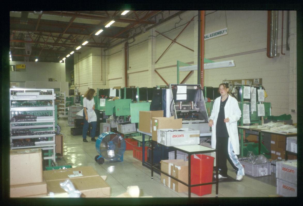 Interior of Ascom Telecommunications Ltd.'s factory in St. Mellons, Cardiff, showing two women at work.