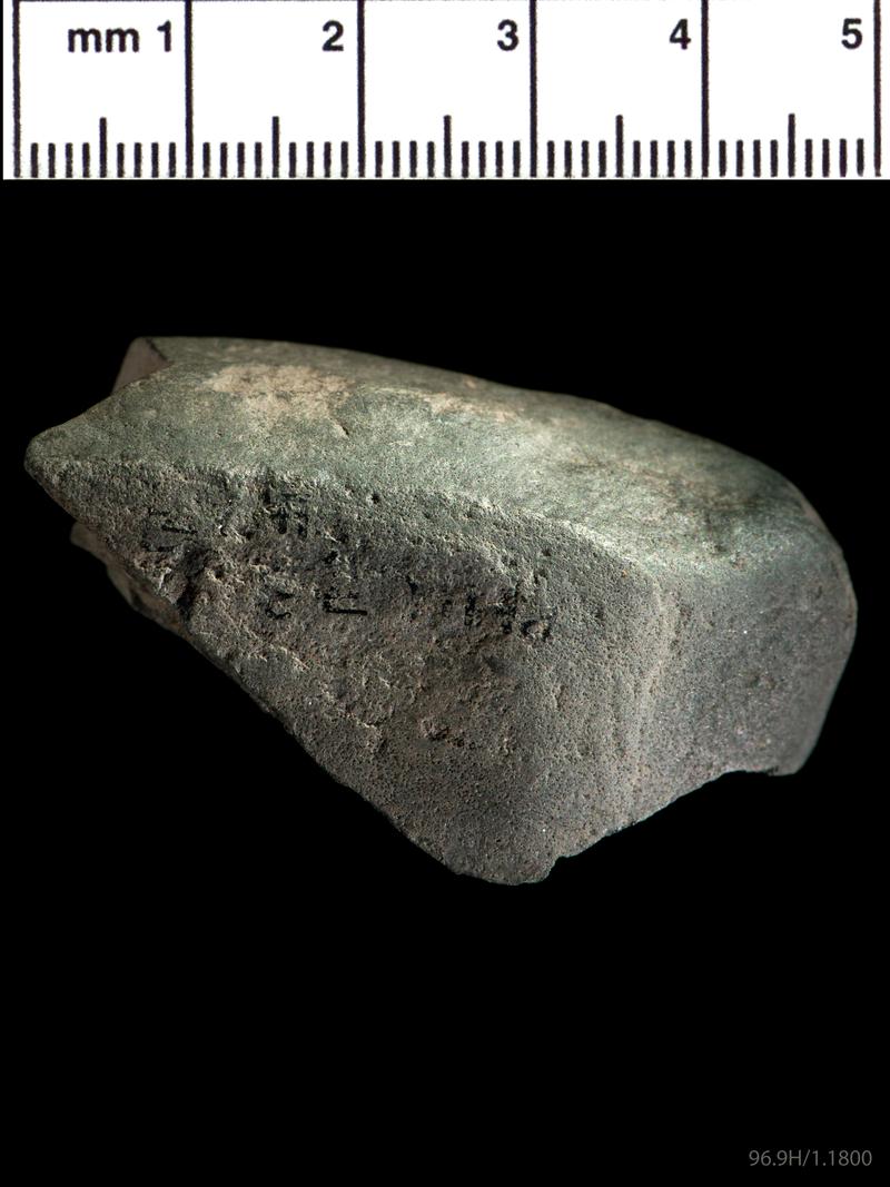 This stone was retrieved during backfilling of soil which cam mainly from Prehistoric horizons H8 and H39. It is a pebble of slightly micaceous silty sandstone with a mostly subrectangular cross-section and breaks at both ends which have clearly occured after decoration. It is 80mm long. All four main surfaces are decorated with a 'tree' motif made up of a central line parallel to the main axis of the pebble from whcih shorter lines branch on either side. Two opposing faces, B and D, have two motifs running in opposite directions as do the single motifs on the other pair of opposing faces, A and C. None of the six survive complete. If the motifs are viewed as though their bases are in the central area of the pebble, then in five of the six (the exception is that on A) the lowest branch lies to the left of the centre line. The fragmentary nature of the motif on A makes its detailed design uncertain; the lowest branch is probably on the right, but, given the complexities of pattern on the other examples, it is possible that the right hand of the two lines parallel to the pebble axis is in fact the central stem in which case it would conform to the others. On face B the second branch of both motifs is on the right, and the third and fourth branches leave the main stem at the same point. On D the second branch is on the left in both motifs. These similarities, at least in the initial stages of the paired motifs, suggest that the branches in the patterns were not laid out entirely at random.