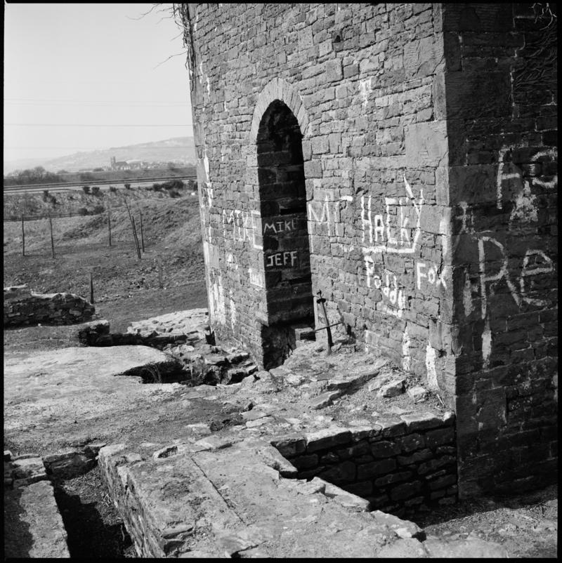 Black and white film negative showing a man stood at the base of the headframe, Llanhilleth Colliery. 'Llanhilleth' is transcribed from original negative bag.