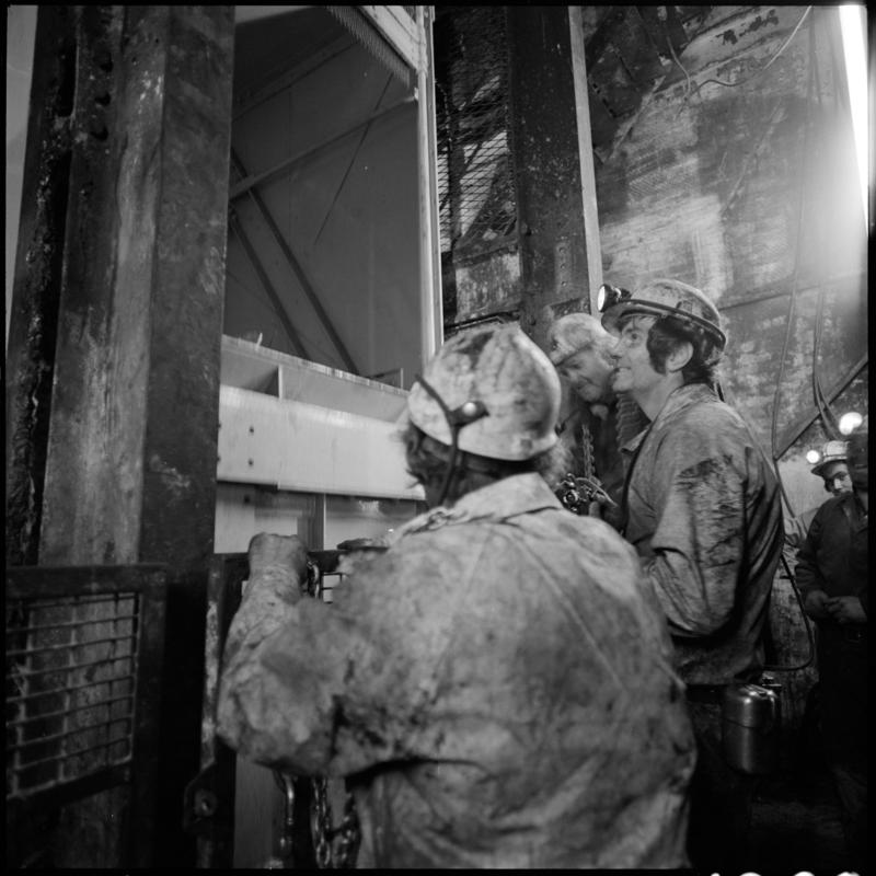 Black and white film negative showing fitters at work in the reconstructed pit bottom, prior to the fitting of the skips, Lady Windsor Colliery.