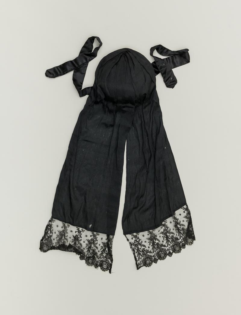 Cocklewoman's hat, about 1920. Made of strips of black plaited straw stitched in circular pattern around crown, with brim at front. Trimmed with edging of straw plait arranged in waves. Stiffened with wire. Brim lined with black cotton.