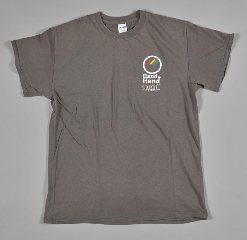 Red cotton jersey printed in white and black capital letters. Back of shirt printed with the Stonewall Cymru logo and website. Tubular weave: no side seams. Unworn.