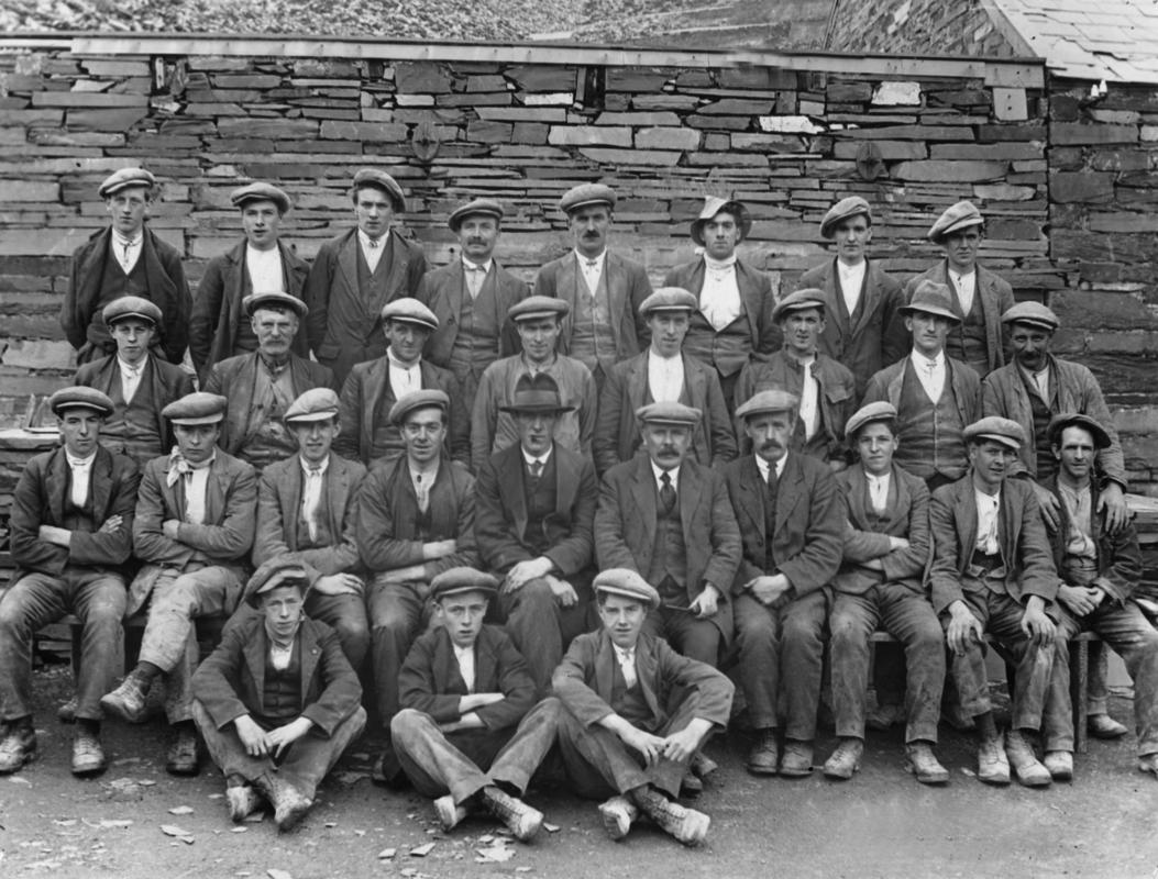 Group of 54 quarrymen outside one of the buildings at Ponc Swallow, Dinorwig Quarry in 1927. The following quarrymen are named (from left to right):- John R. Griffith, Pen Lan, Deiniolen (second row from top, far left); sitting in front of John R. Griffith is his brother, Ebenezer Griffith; Ebenezer Griffith, Pen Lan, Deiniolen (third row from top, third sitting down). Mounted on card.