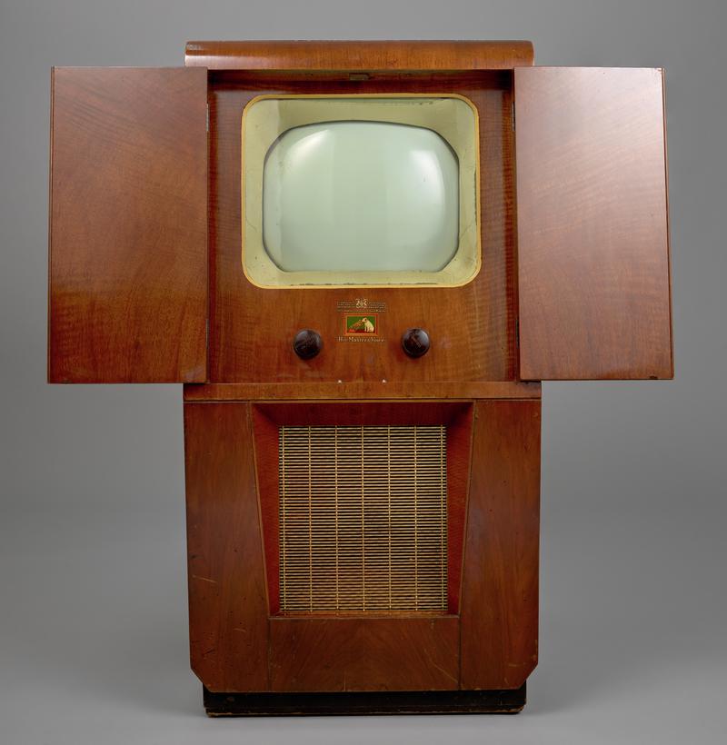 ii) Metal strip, 33cm x 3 cm, right of screen, containing, from top to bottom, a pull-on and volume control, a brightness control (both cuff-link shaped plastic), a colour control, and a tint control (both rectangular plastic in 4cm sliding slots).