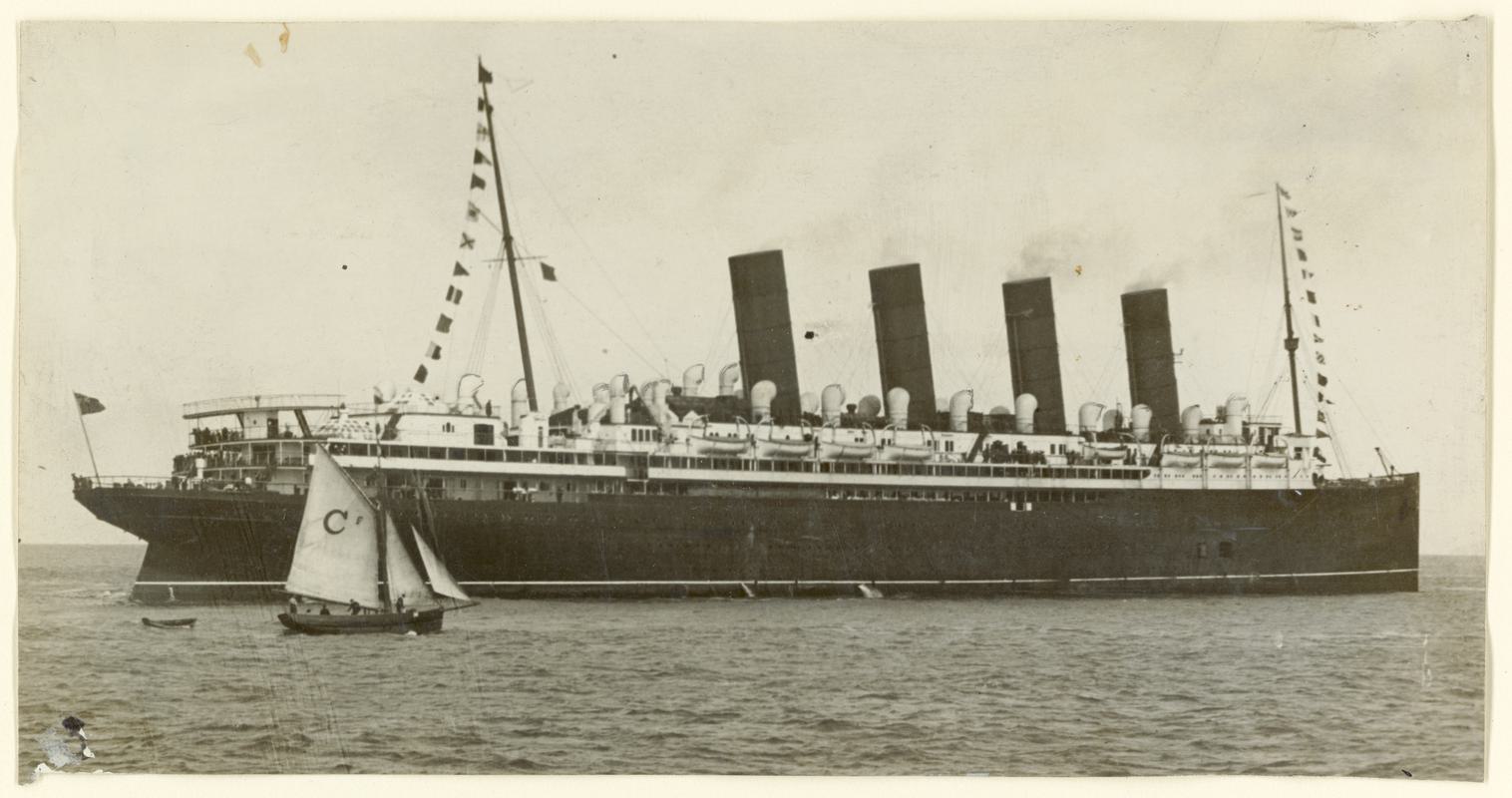 View shows passengers landing off the S.S. MAURETANIA at Fishguard.