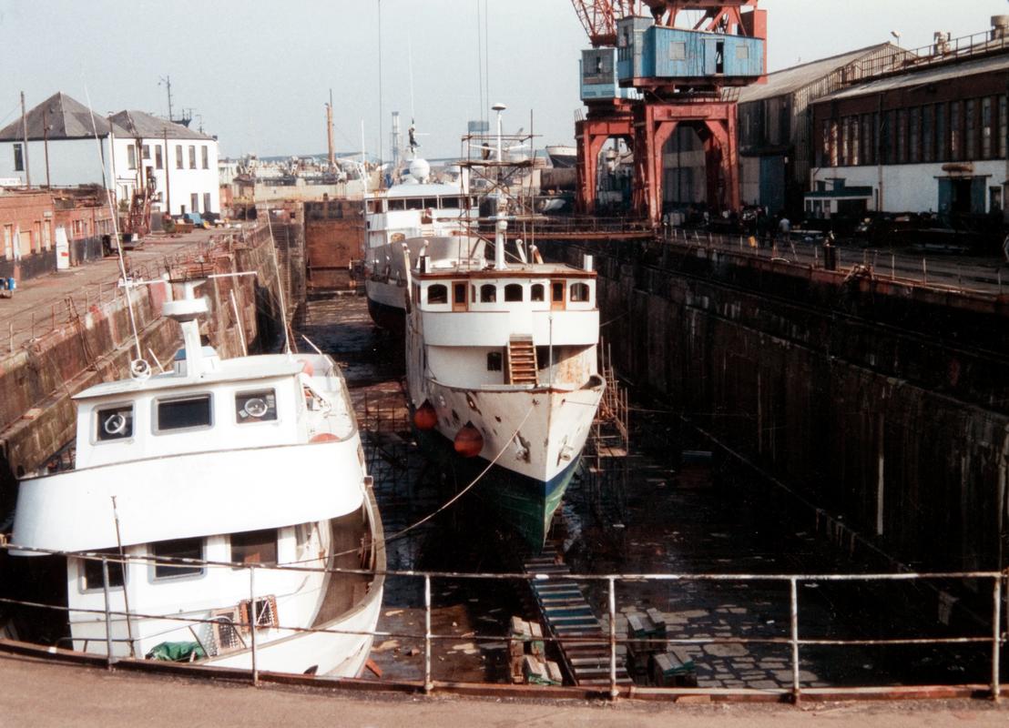 Colour photograph showing the yacht WELSH LIBERTY being rebuilt in the Bute Dry Dock, Cardiff, 1988. This yacht was part of a charter fleet of yachts owned by Dragon Yachts of Cardiff, one of C H Bailey's enterprises.