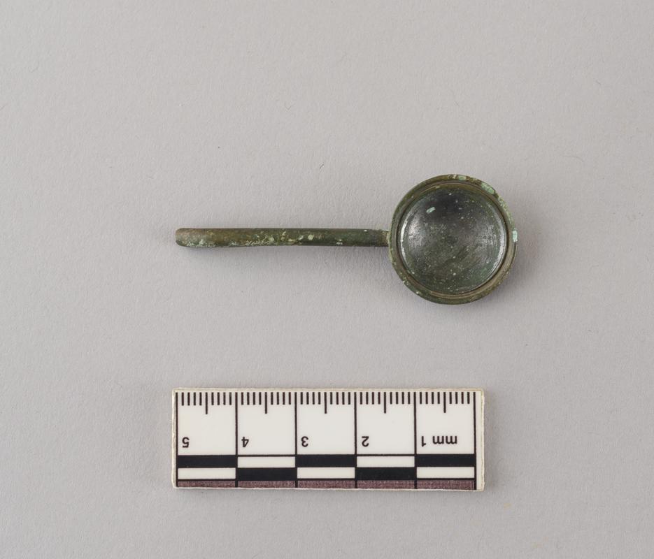 Two piece brooch. The spring is held in place by means of an axial bar which passes through pierced discoid terminals to the rather scruffy side wings and by means of a forward hook which emerges from the head to secure the external chord. The bow is of flat rectangular cross-section and in profile descibes an angle close to the head. It is broad at the top and tapers towards the foot. Down the centre of the bow is indented ?beaded ornament set within longitudinal lines.