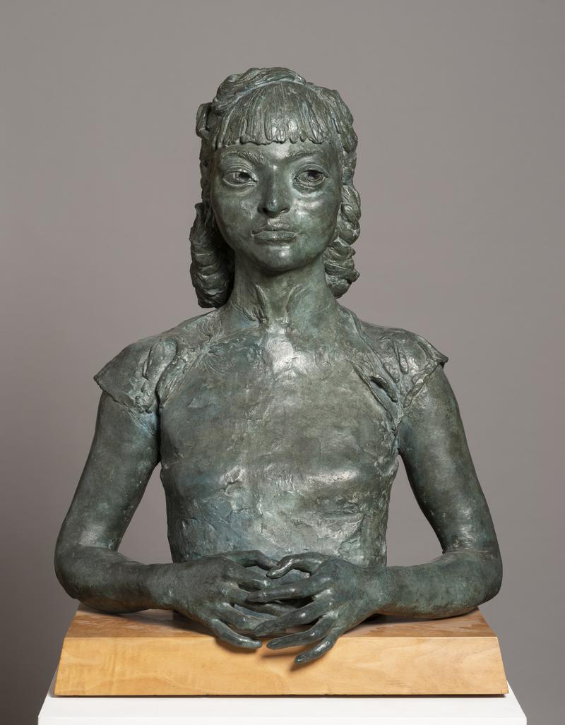 Mae'r cerflun bach, haniaethol hwn wedi'i wneud o haearn wedi'i weithio a'i weldio. Bu’r artist, Reg Butler, yn gweithio fel cynorthwyydd i Henry Moore, cerflunydd sy'n adnabyddus am ei ffigyrau syml, llyfn a siapus. Mewn cyferbyniad, mae ffurf pigog, linellol Menyw yn ei Chwrcwd Butler yn wahanol iawn i ffurf menyw corff llawn Moore. Mae ganddi gorff tenau, lletchwith, tebyg i gleren ac mae yn ei chwrcwd ar ei thair coes fel petai ar fin neidio. Mae'r siapiau a wneir gan ei chorff yn anghyfforddus, yn rhyfedd ac yn fygythiol ar yr un pryd.