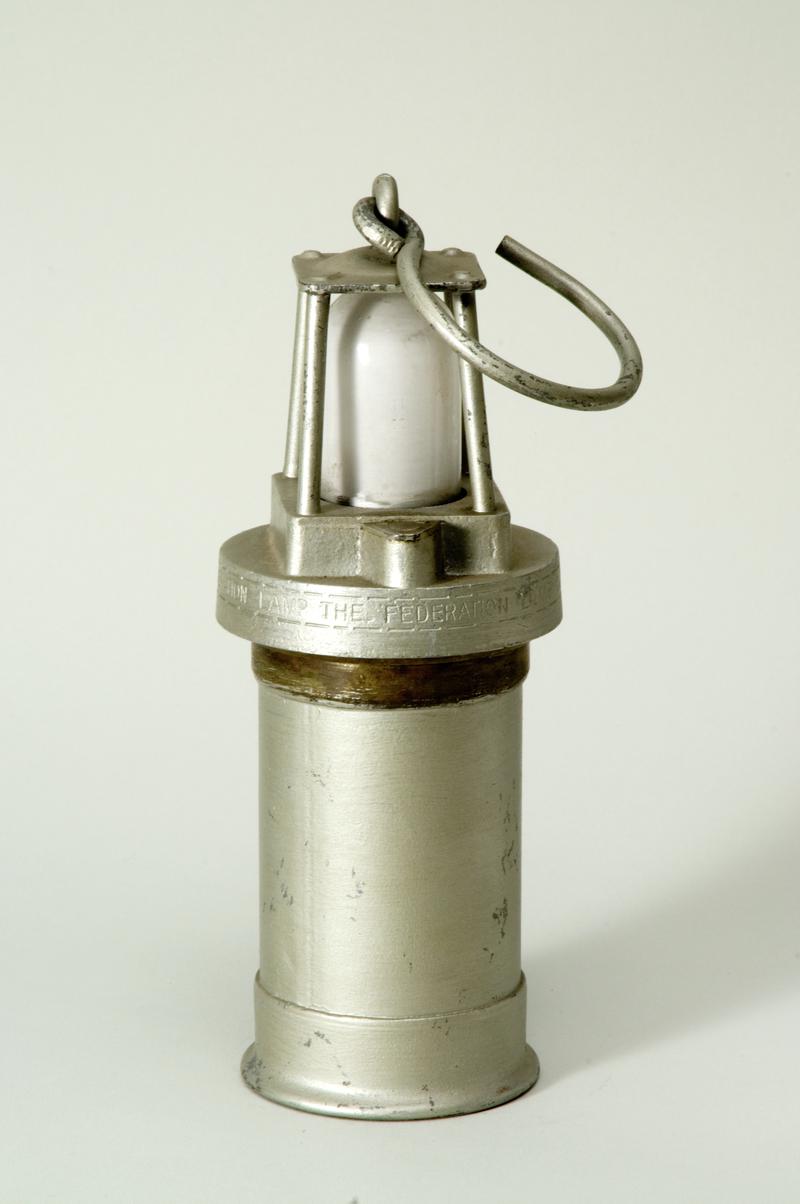 Brass flame safety lamp with embossed makers plaque and presentation plaque on front.