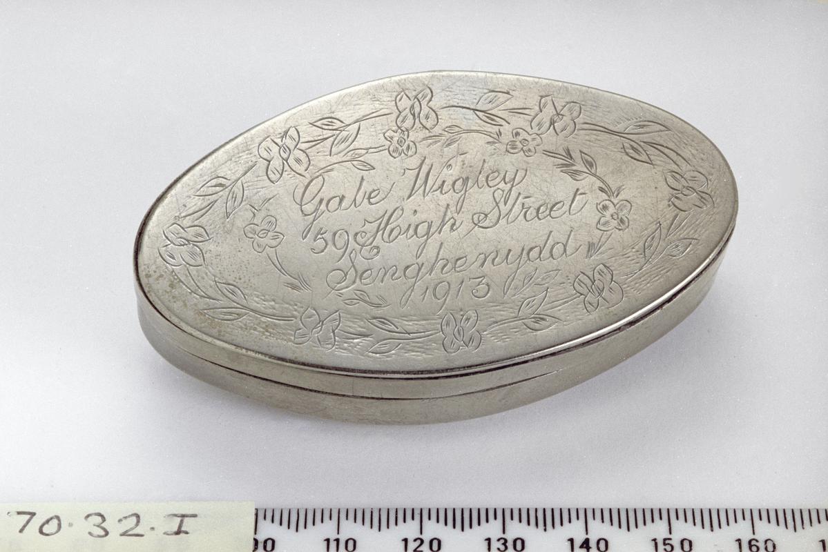 Oval brass twist box with hinged lid with two pins top edge and owner details in central oval surrounded by "S" design and one pin beneath hinge at rear on side, and date stamped on base