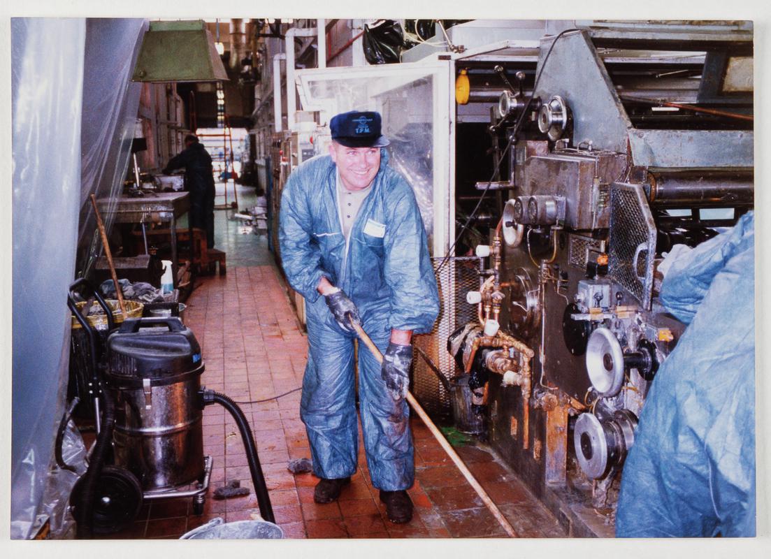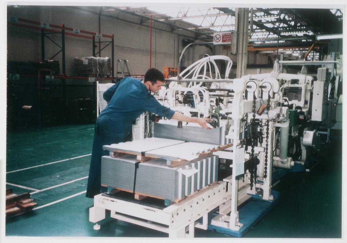 Female worker and press machine, The Metal Box Company Ltd, Neath.