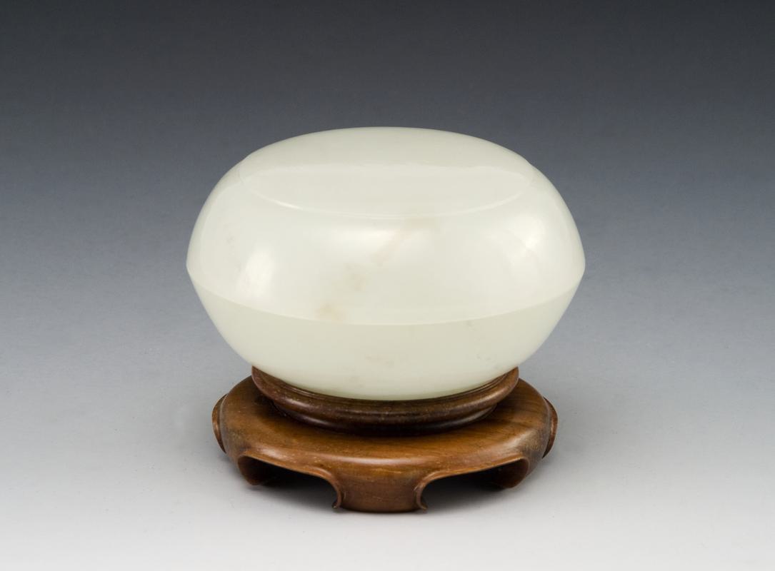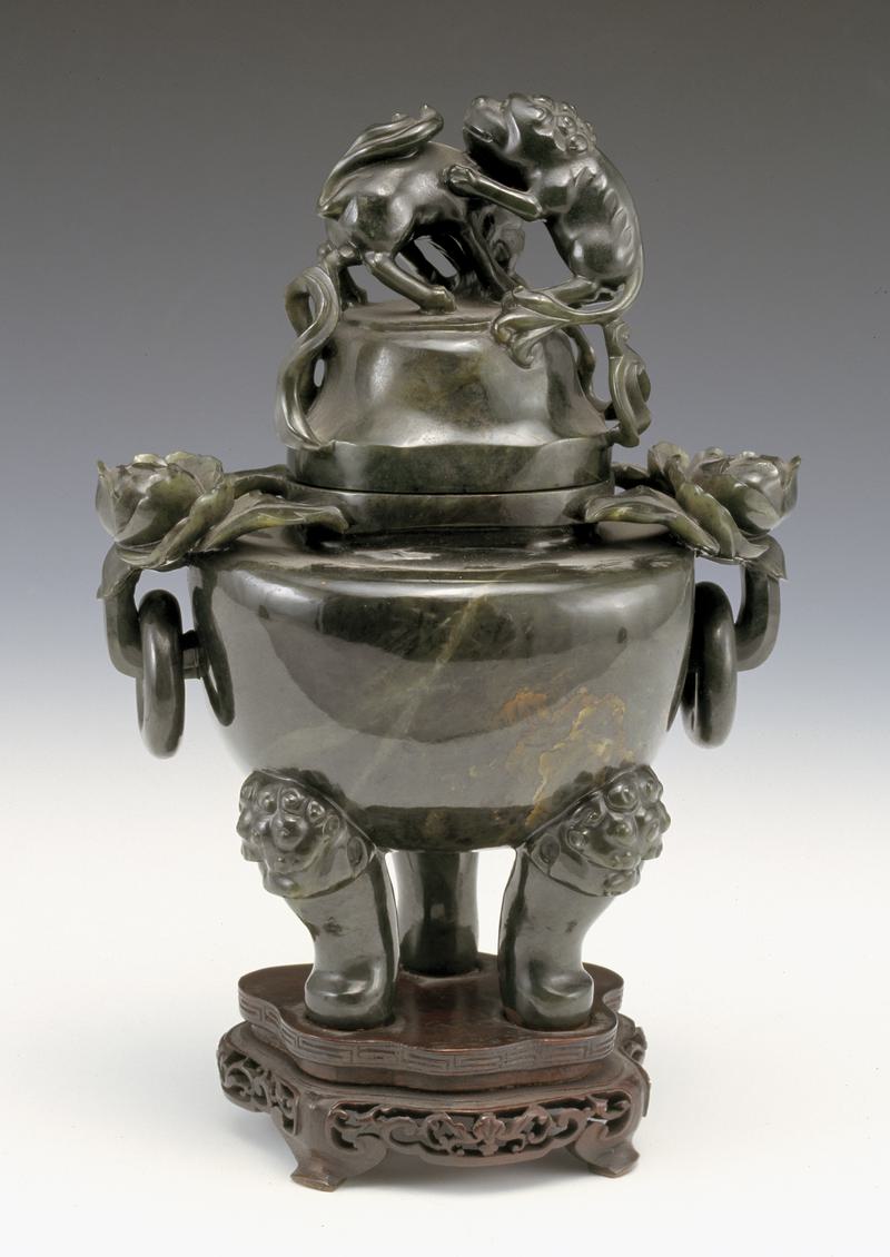Tripod vase, based on an ancient bronze shape, of dark green jade, domed cover, steeply rising handles, with wooden stand.