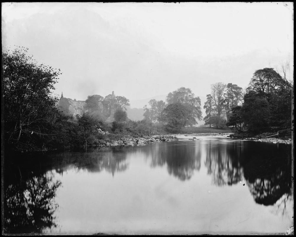 Collodion glass negative showing the River Wharfe at Bolton Abbey, Yorkshire. Some black paint on sky.