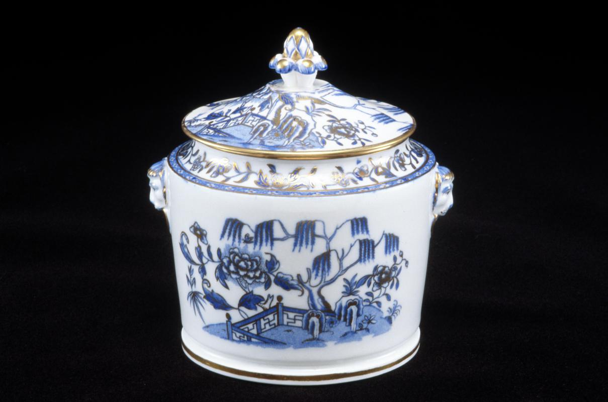 Plate, porcelain, ovoid-shaped body with an everted rim on a circular pedestal base, two side loop handles; the edges and handles are gilded, one side of the body is painted with flowers and the other is painted with a cottage in a landscape.
