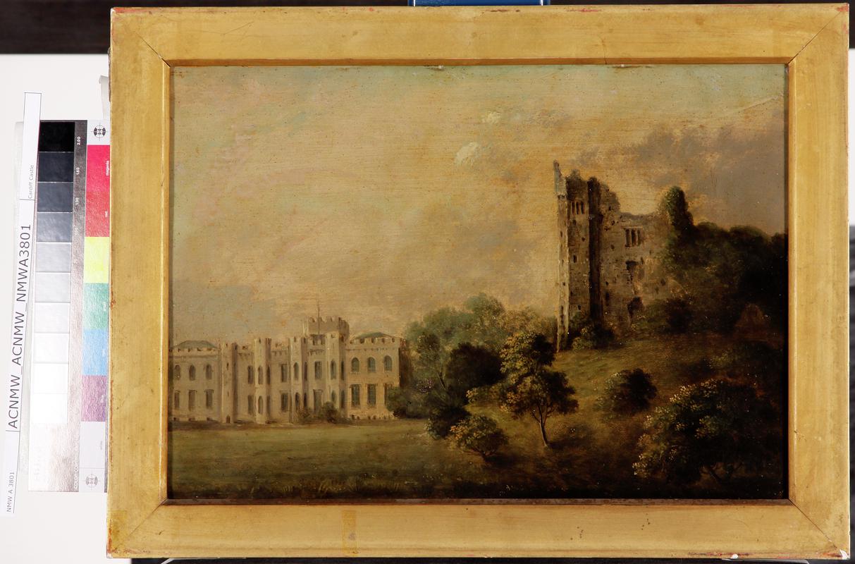 Cofnod topograffigol o le a pherchnogaeth yw’r paentiad hwn, sy’n dyddio o’r 1740au mwy na thebyg. Mae’n dangos adfeilion anferthol Castell Caerffili o’r Fan, maenordy o ddiwedd yr unfed ganrif ar bymtheg a chartref y Lewisiaid, a adeiladwyd â cherrig o’r castell.