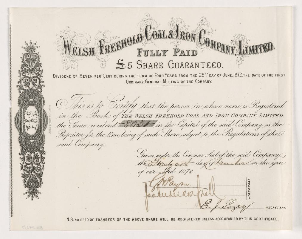 The Dunraven-Adare Coal & Iron Company Limited, £10 ordinary shares, 1872, black on white, vignette of train. * Black print on white paper with handwritten details completed in black ink. Ornate border surround. Black and white vignette of train with coal/ironworks printed on left hand side. Embossed company seal on lower left hand corner depicting an embossed image of the Prince of Wales' feathers in centre. 1 £10 share numbered 5479. Certificate number '5479'. Dated 4 September 1872. Issued to James Russell Ross. Printed signatures of two directors and Thomas Lewis (Secretary).