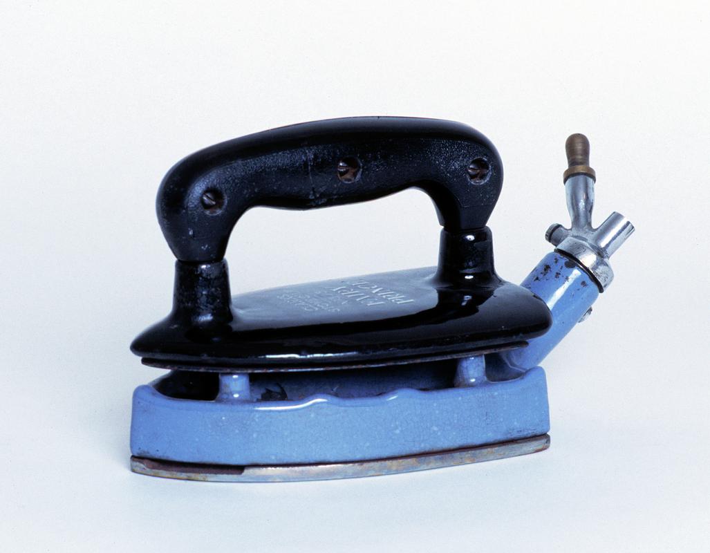 Gas oven on 4 adjustors; exterior casing of cream stove-enamel, interior lining of blue stove-enamel; consisting of 4 jets with cast iron burner; top frame; eye-level grill with hinged drop-type door to hold aluminium grill pan; chromed plate rack above; control knobs on front panel; oven with hinged drop-type door with aluminium bar handle and 3 chromed removable rack-type shelves; Regulo control knob on front panel; warming drawer below oven with aluminium bar handle; pilot-light fitting complete.