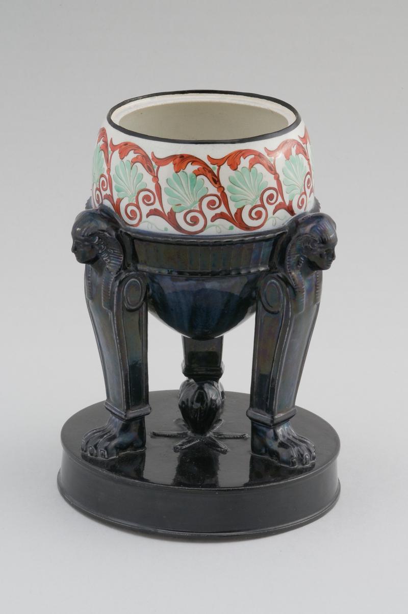 Pastille burner; bowl with ogee curved sides and slightly pointed base with pendant acorn knop, supported on three modelled dolphins on a triangular pedestal base with concave sides. Decorated in underglaze blue, bowl and pedestal base with silver lustre decoration.