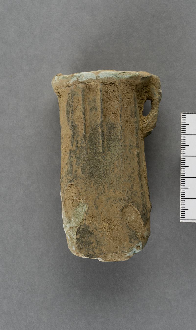 Without loop and with shield-shaped hollows below the stop-ridges. It is badly corroded, with patches of dull brown patina remaining; there is a casting flaw, consisting of two deep pits, one on each side at the junction of the stop-ridge and the septum.