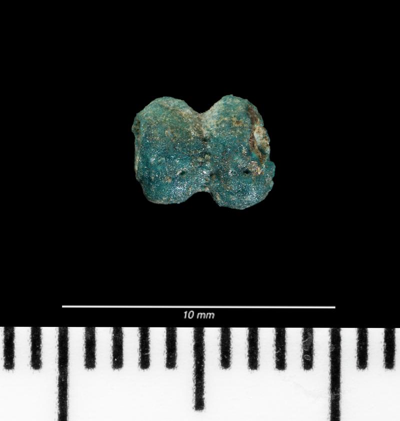 Socketed gouge with plain circular socket mouth, which is slightly expanded and flat topped. Gouge has straight sides with no splaying at blade end. Socket base is lunate in cross section. Central part of blade edge survives, but both margins have been damaged, probably recently. Faint linear striations up blade groove and slight denting on lower blade surface, possible use wear evidence. Transverse striations around the middle and upper socket may indicate further use wear. Dark green patina with some lighter green carbonate encrustation. There is a patch of black patination beneath the socket mouth.