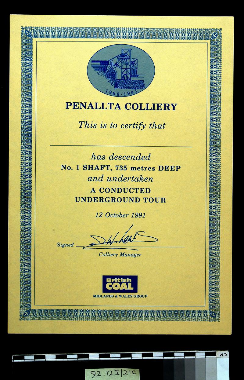 Souvenir certificate of underground visit to Mardy Colliery ("the last pit in the Rhondda") during Open Day on 16 December 1990. Issued to B. Jones.