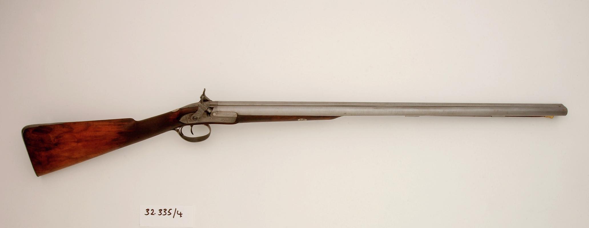 percussion cap, pepperbox type (6 barreled); wooden butt, with engraved plate