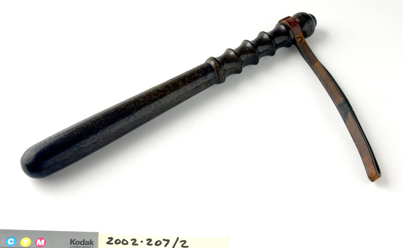 Brown finish wooden police truncheon with leather wrist strap. Manufacturers reference "TN8060 Riot Baton 8060 C/Grip".