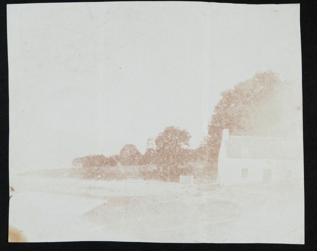 Salted paper print showing tree and rock overhanging river in the Dulais Valley.