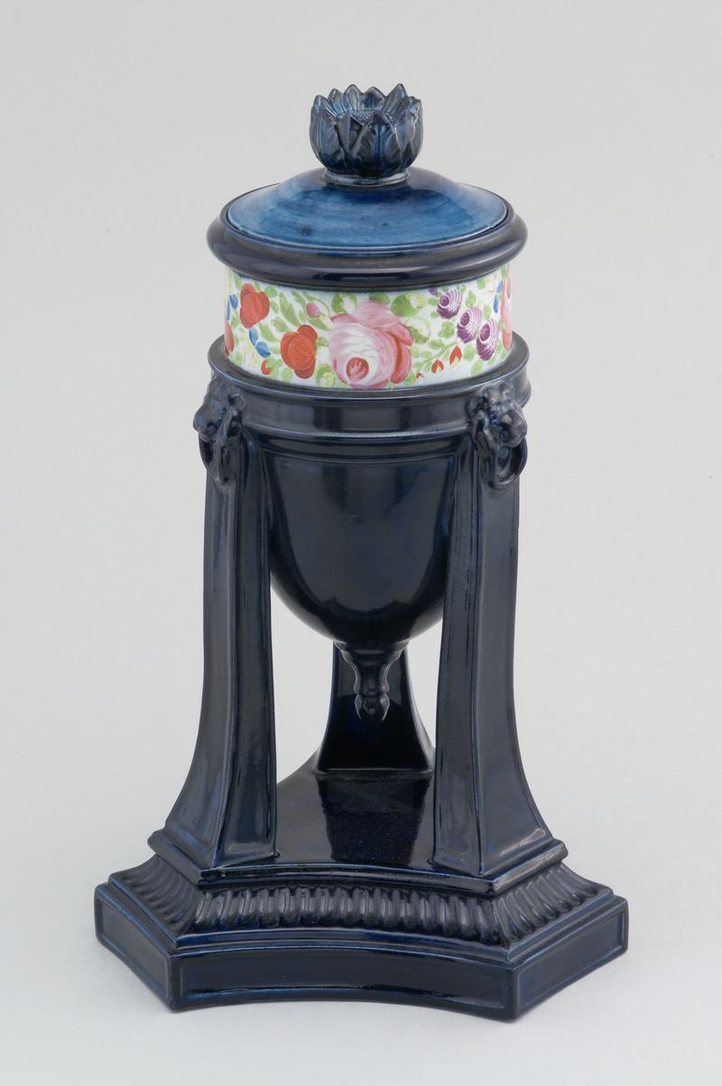 Toothbrush box, earthenware, in the shape of a round-ended oblong with flat base, vertical sides and flaring everted waved rim, an inner flange within the rim, two curving partitions across the well of the box extending a short way up the sides, domed cover in the shape of a round-ended oblong, an incised band around the top of the cover, to the top of the cover an upright loop handle moulded in the form of scrolling foliage with a flower head in the centre; transfer-printed in flow blue with to the top of the cover a scaled down version of the 'Whampoa' pattern showing a collection of elaborate pagodas linked by bridges and fences with a spreading willow-like tree hanging over them, border to the exterior sides of the box, the rim of the box and and rim of the cover of flower heads, foliage and scrolls on a scale blue ground.