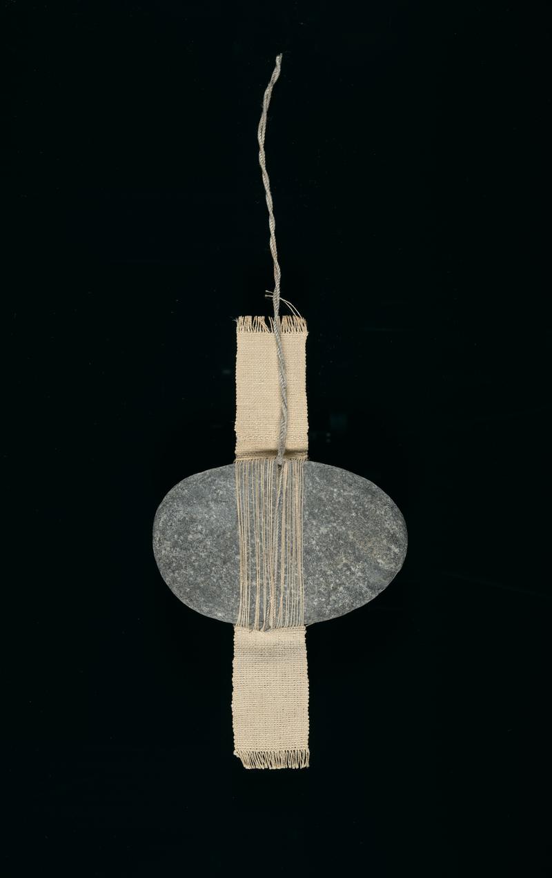 Sitting stone weaving. Natural linen plain weave, narrow bands of natural wool in twill. Oval, mottled stones, one light, one dark.