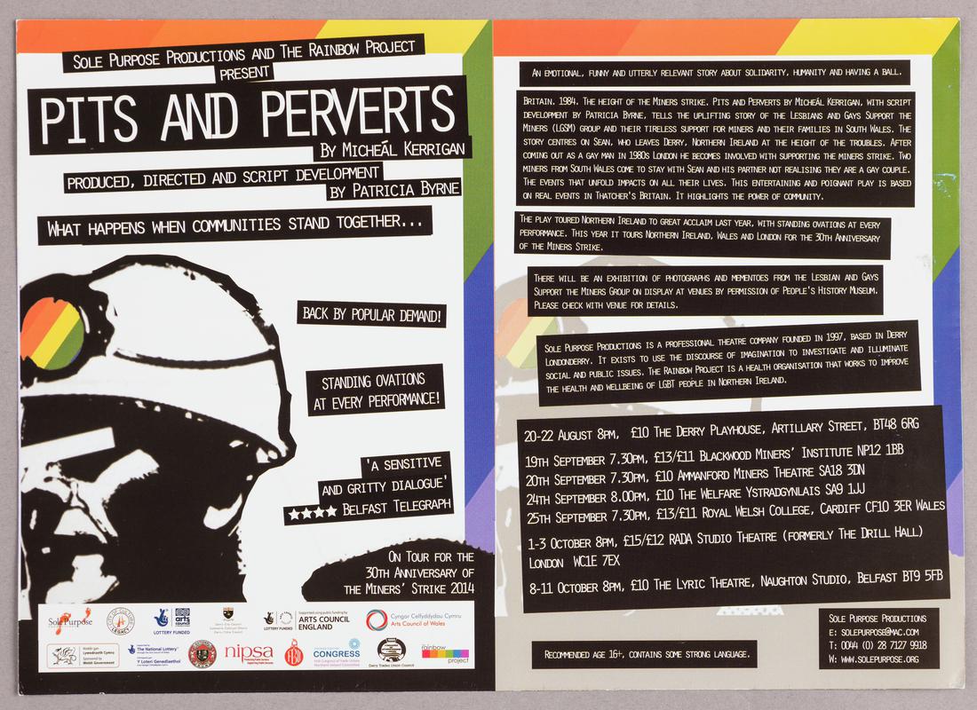 Programme for play 'Pits and Perverts' by Micheal Kerrigan. On tour for the 30th Anniversary of the Miners' Strike 2014. Single sheet, folded once.