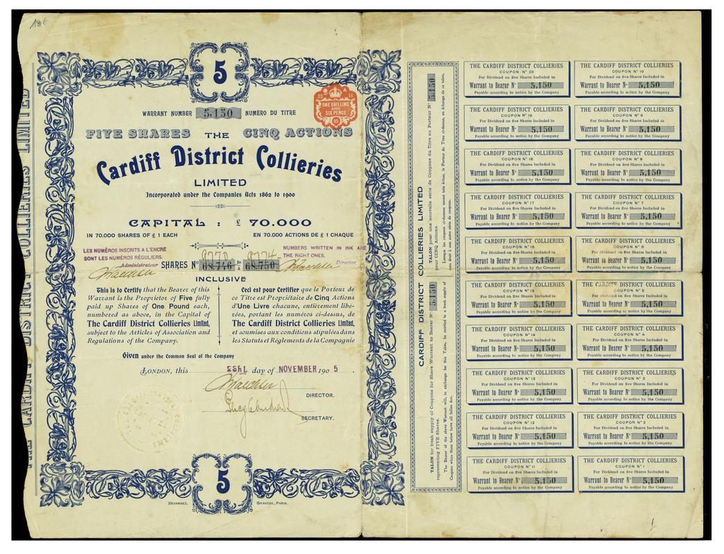 Cawdor & Garnant Collieries Limited, £4 ordinary shares, 1906, brown on green and white. * Brown print on green and white paper with handwritten details in black ink. Ornate border surround. Embossed company seal on lower right hand corner. 18 dividend coupons attached to right of certificate. 1 £4 share numbered 19588. Certificate number '3086'. Dated 22 August 1906.