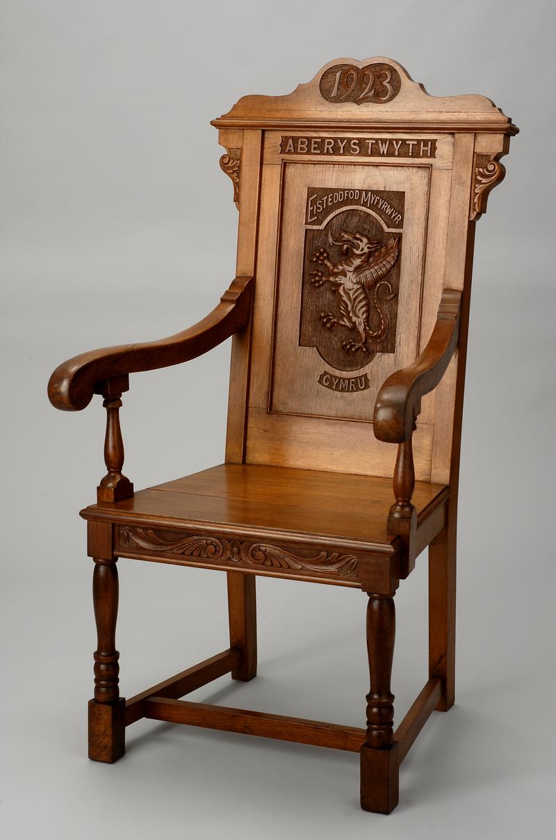 miniature wooden chair on four legs with arm rests and diamond shaped pattern moulded on back splat