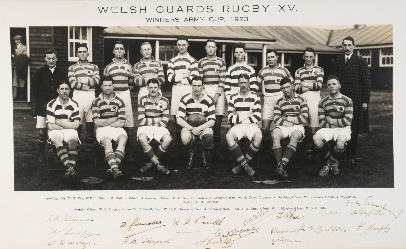 Photograph of T.H. Vile and Percy Bush in Welsh rugby kit, with Percy Bush's autograph beneath photograph.