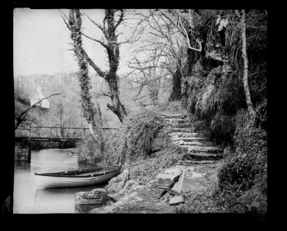Collodion glass negative showing an old stone bridge over the river at Penllergare.