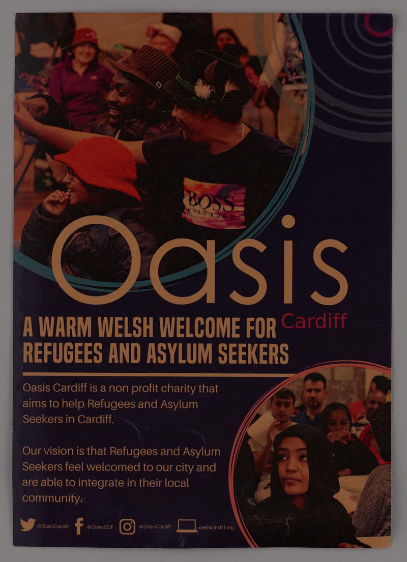 Double-sided card produced by Oasis Cardiff – a charity founded in 2008 that aims to help refugees and asylum seekers in Cardiff. The card is printed with 'THANK YOU FOR YOUR DONATION' on the front, and information about the work of the charity on the back.