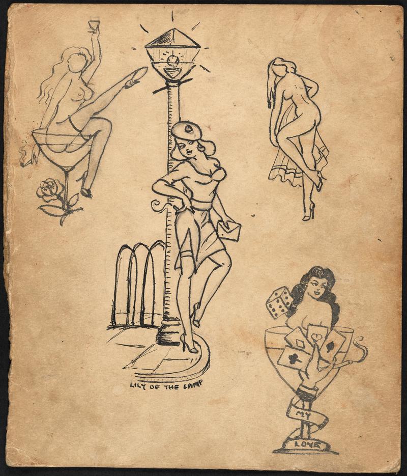 Pencil drawing on thin card. Male figure and mermaid embracing.