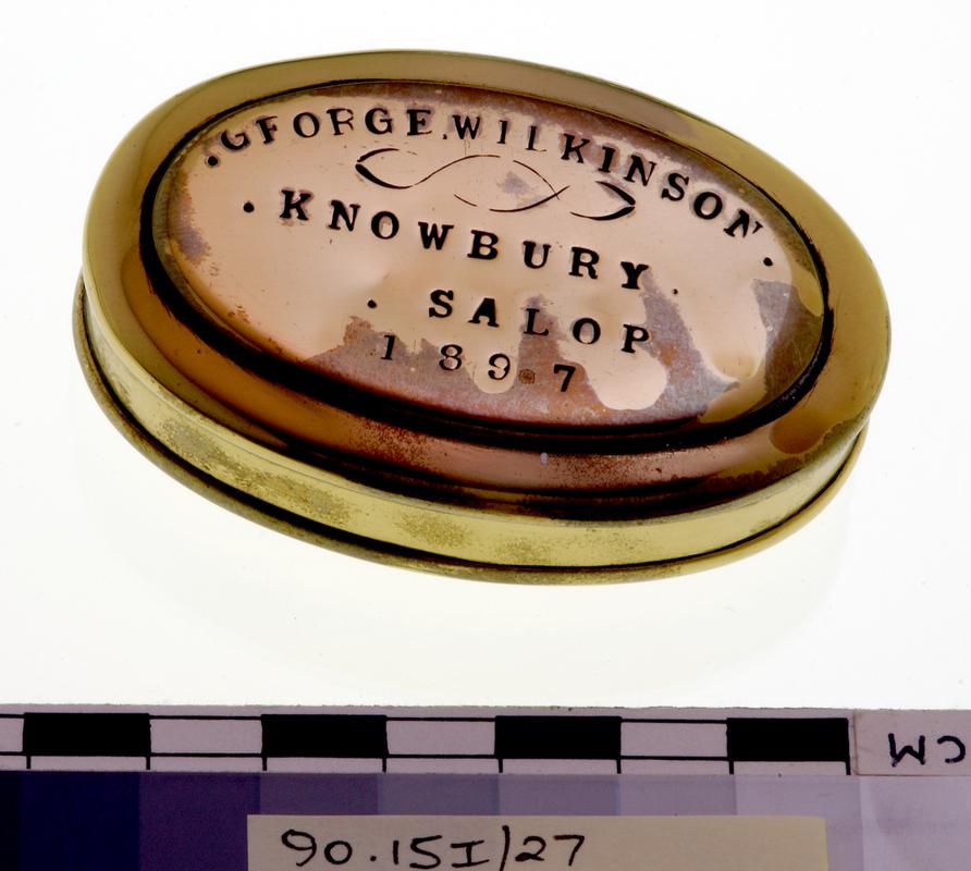 Oval brass twist box with hinged lid on which owner details stamped but well worn and only partially visible, still contains twist.