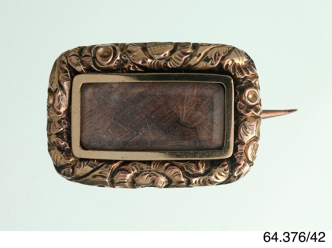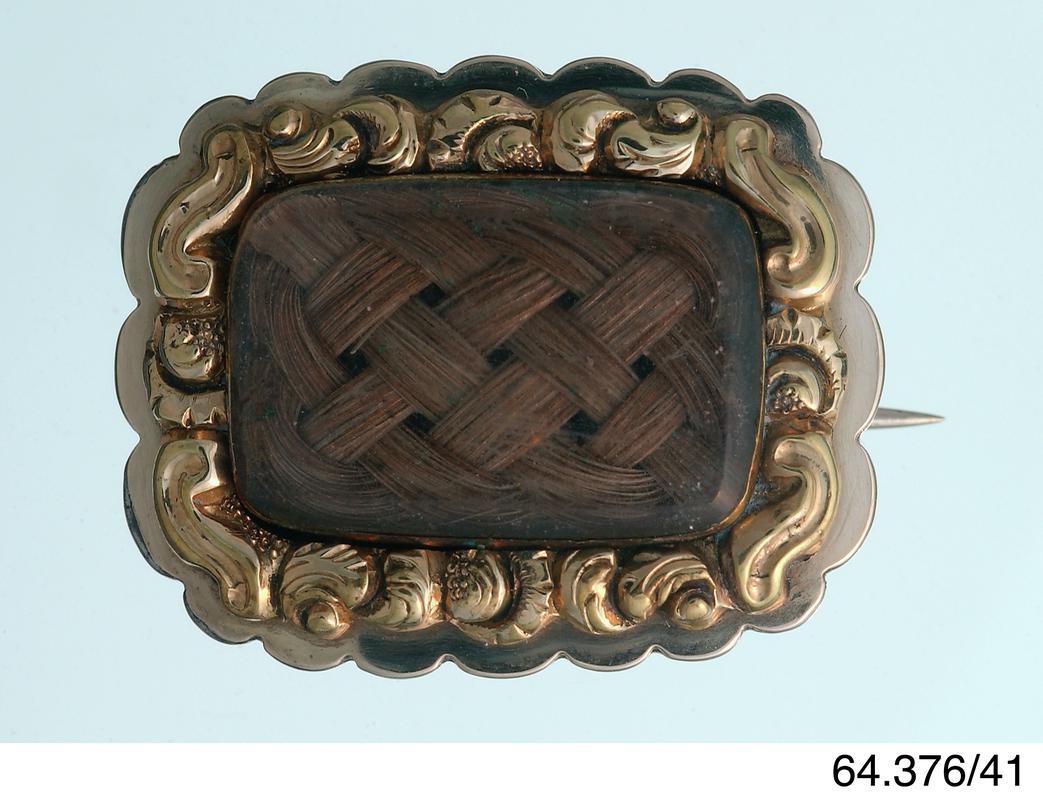A small memorial brooch made from the hair of Harriet Kelshaw who died when she was 11. Inscribed: 'Harriet Kelshaw Obt. 4th June 1825'.The brooch has a brass border which curves round the corners to form points half way between each corner. Inside the border is an black enamel border, inside this is a floral brass border, this surrounds a piece of plaited hair which is covered by glass.